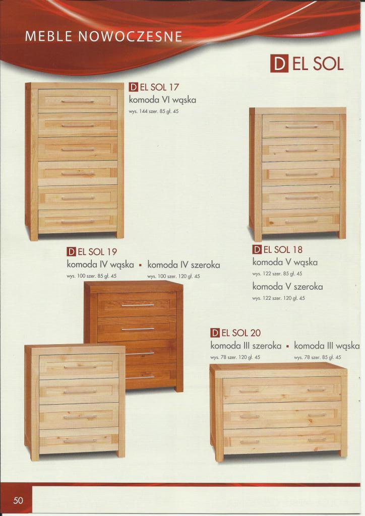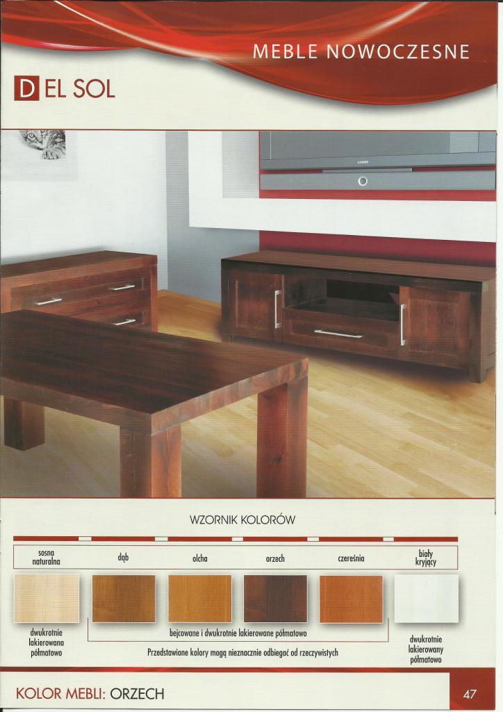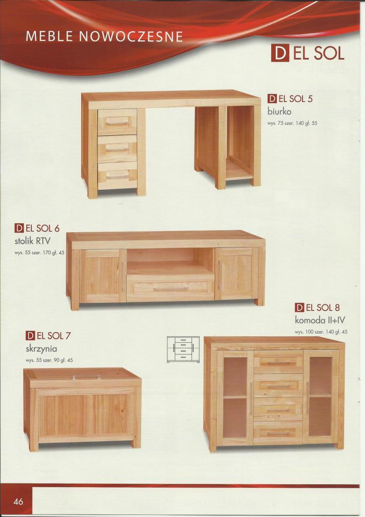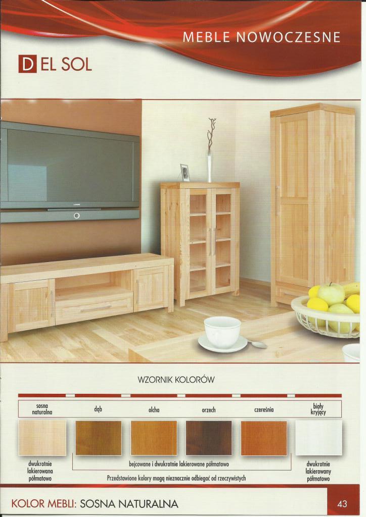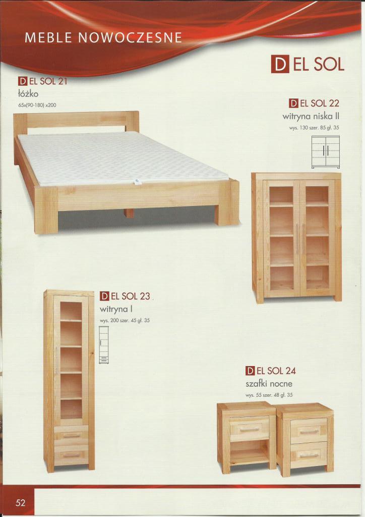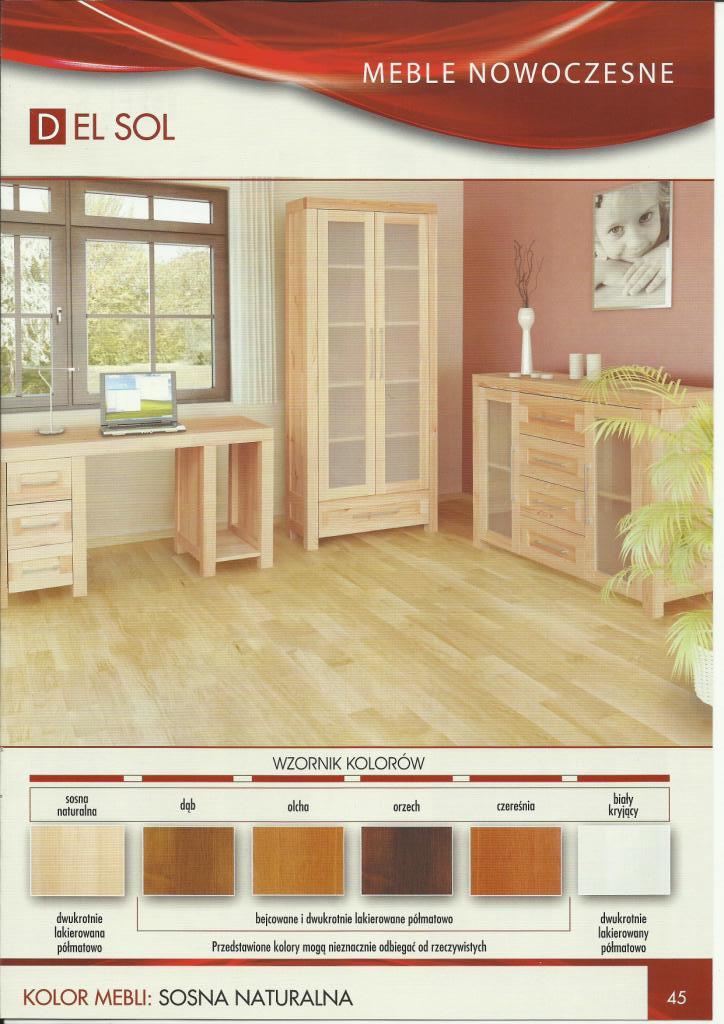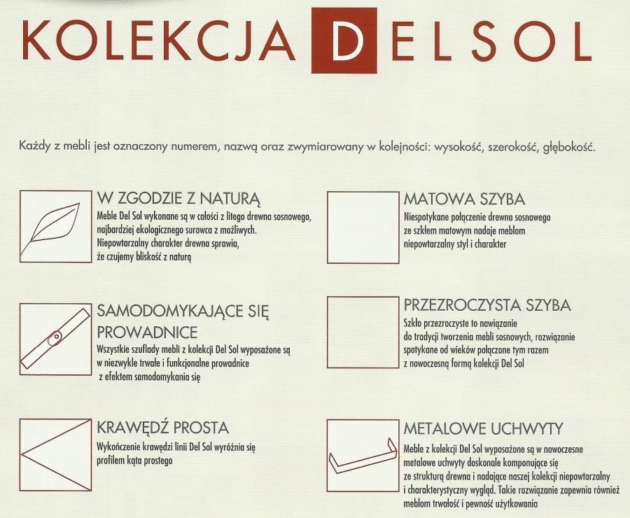 Linia mebli Del Sol powstała dzięki nowym możliwościom technologicznym jakimi obecnie dysponuje producent. Zmodernizowany park maszynowy sterowany komputerowo stwarza wiele możliwości w produkcji nowoczesnych i wysoko jakościowych mebli. Kolekcja Del Sol jest połączeniem oczekiwań klientów i najnowszych światowych trendów w projektowaniu mebli. Łączy w sobie nowoczesność z naturalnym, tradycyjnym i najbardziej ekologicznym surowcem jakim jest lita sosna. Piękno, prostota, solidne wykonanie gwarantujące trwałość na lata, atrakcyjna linia a jednocześnie bliskość natury, to wszystko wyróżnia meble z linii Del Sol.